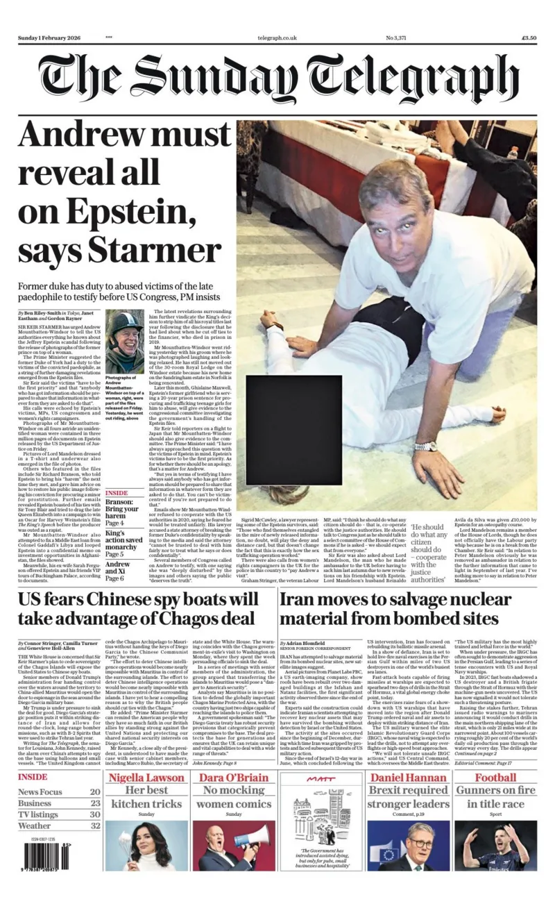 «¡Qué vergüenza!», titula el Sun del domingo . El Daily Star Sunday llama al ex príncipe un «bicho raro». El Sunday Telegraph sugiere que Andrés debería «revelar todo sobre Epstein». En lo que califica de «exclusiva bomba sobre Epstein», el Sunday Mirror advierte que «lo peor está por venir». El Sunday Times afirma que «Carlos ha retirado los títulos de Andrés… pero nunca podrá borrar el daño». Pero el Telegraph sugiere que «al destituir a Andrés rápidamente, el rey podría haber salvado la monarquía».