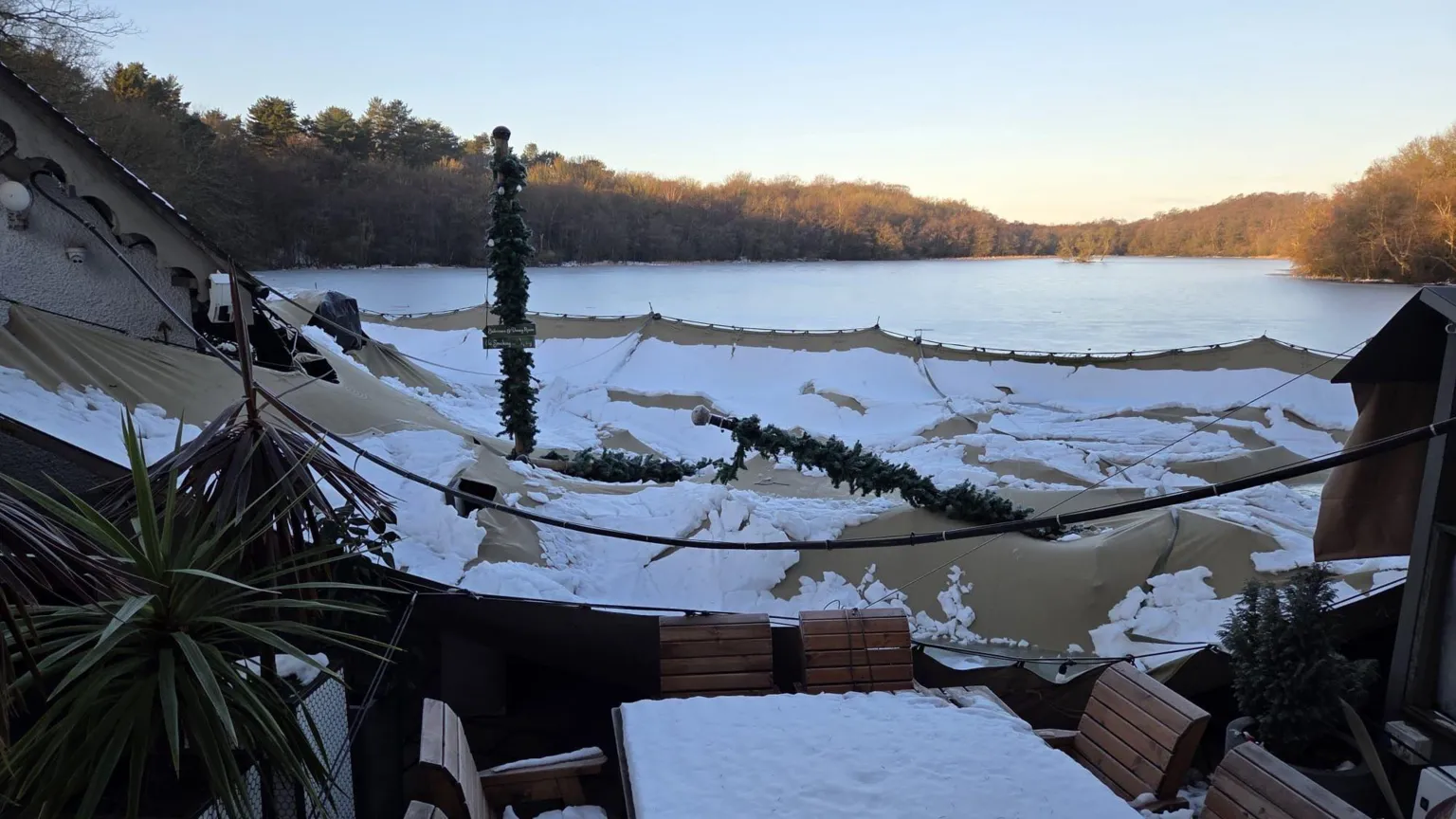 La tormenta provocó que la gran carpa abierta del lugar se derrumbara, aplanando los muebles, rasgando la estructura y cortando la conectividad a Internet.